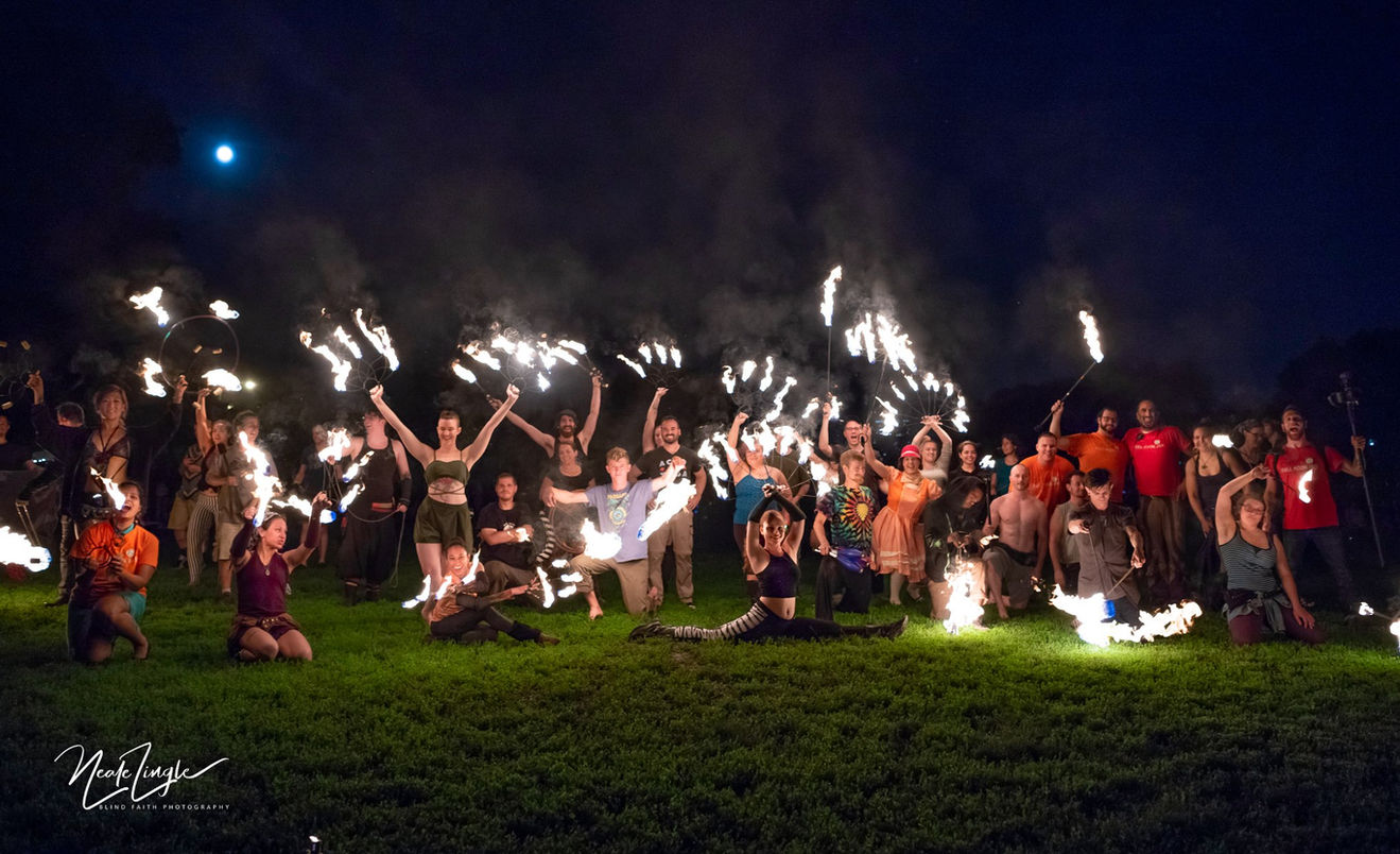 As the audience gathered in preparation for the Moonlight Parade fire spectacle, the Full Moon Jam Foundation held open poi and hoop workshops. These non-fire, all-ages, beginner workshops were generously led by seasoned Full Moon Jam performers and teachers. All comers were welcome to dance and try out non-fire movement props, as an introduction to the wonderful world of dance and flow.